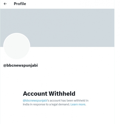 नई दिल्ली, 28 मार्च (आईएएनएस)। पंजाब में खालिस्तानी समर्थक तत्वों के खिलाफ चल रही पुलिस की कार्रवाई के बीच अधिकारियों ने बीबीसी पंजाबी के आधिकारिक ट्विटर अकाउंट को ब्लॉक कर दिया है।