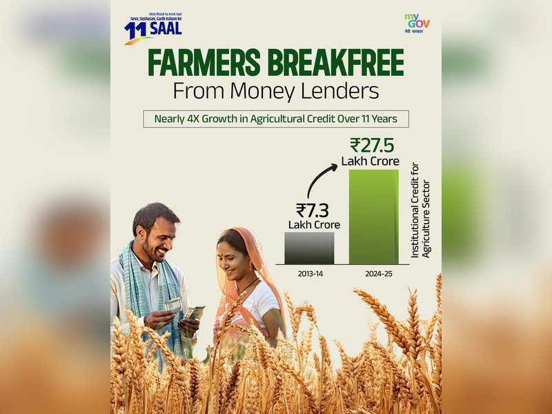 नई दिल्ली, 7 जून (आईएएनएस) पिछले 11 वर्षों में प्रधान मंत्री नरेंद्र मोदी की सरकार के तहत, कृषि के लिए संस्थागत क्रेडिट 7.3 लाख करोड़ रुपये से बढ़कर 27.5 लाख करोड़ रुपये हो गया है, वित्त मंत्रालय ने शनिवार को कहा।