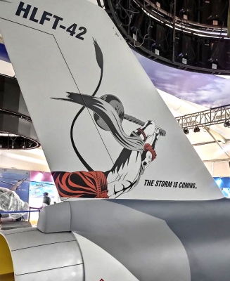 एचएलएफटी-42 विमान मॉडल की पूंछ पर भगवान हनुमान की तस्वीर उभरी हुई थी। तस्वीर में टैगलाइन तूफान आ रहा है भी था। स्टिकर के पीछे की मंशा के बारे में पूछे जाने पर, एचएएल के सीएमडी सीएम अनंतकृष्णन ने सिर्फ इतना कहा कि हमने सिर्फ विमान की ताकत दिखाने के लिए स्टिकर लगाया था, लेकिन एक आंतरिक चर्चा के बाद हमने इसे न लगाने का फैसला किया, इसलिए हमने इसे हटा दिया।