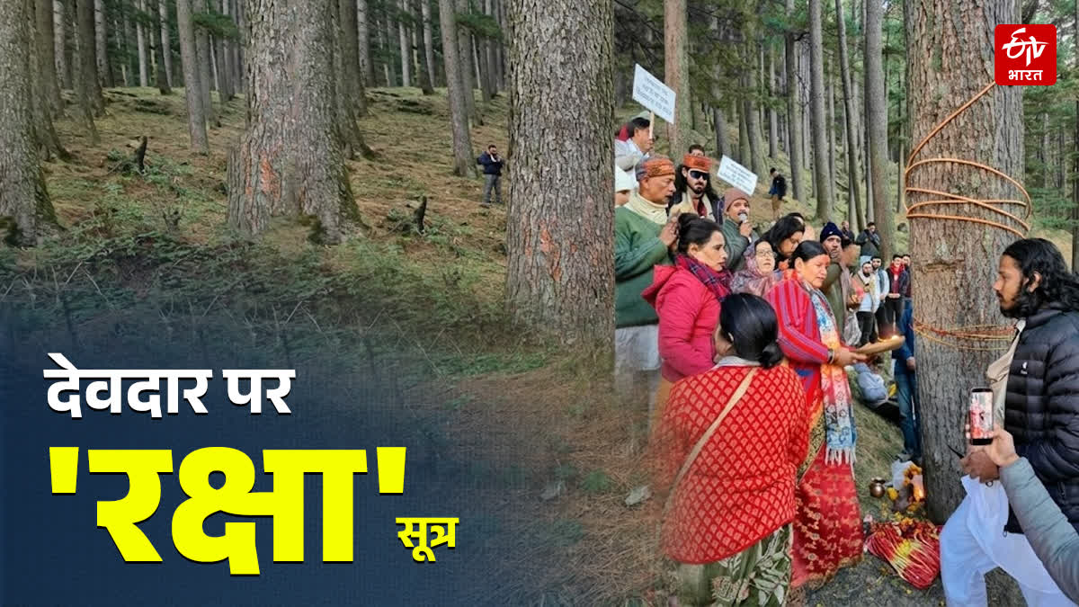 देवदार के पेड़ों को रक्षा सूत्र बांधते पर्यावरण प्रेमी (Photo- ETV Bharat)