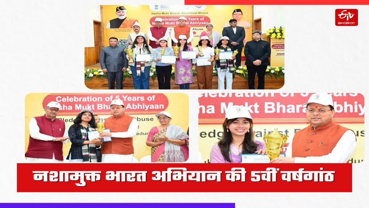 नशा मुक्त भारत अभियान के 5वीं वर्षगांठ पर कार्यक्रम: कार्यक्रम के दौरान मुख्यमंत्री पुष्कर सिंह धामी ने नशामुक्त भारत अभियान के पांच साल पूर्ण होने के पर युवाओं से अपील की है कि वो स्वयं भी नशे को पूरी मजबूती के साथ ना कहें. साथ ही अपने साथियों को भी नशे को ना कहने के लिए प्रेरित करें. कार्यक्रम के दौरान सीएम ने युवाओं को नशा मुक्त भारत अभियान की शपथ भी दिलाई. साथ ही स्कूल कॉलेजों में राज्य स्तर पर आयोजित भाषण और निबंध प्रतियोगिता के विजेताओं को सम्मानित किया.